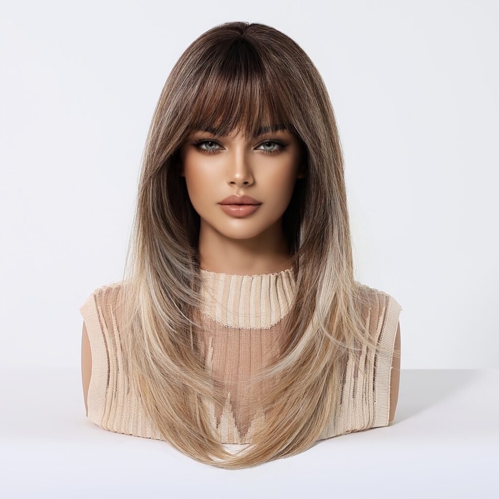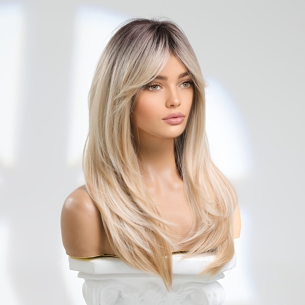 Elegant Long Straight Synthetic Hair Wig with Layered Bangs – High-Temperature Fiber, 150% Density, Rose Net Cap, Suitable for All Light Beige Tones, Perfect for Casual Attire