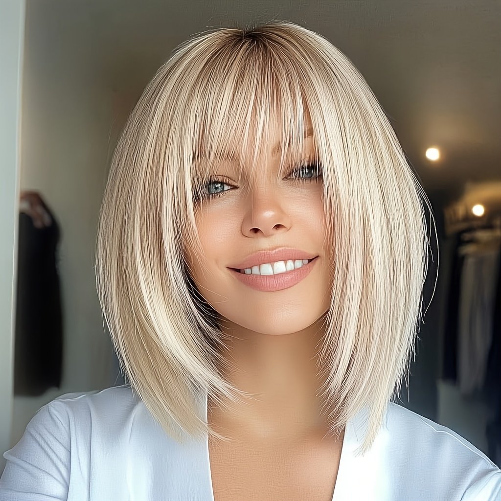 Light Brown Short Hair Wig with Bangs – Lightweight & Breathable Synthetic Fiber, 150% Density, Straight Hair, Perfect for Music Festivals, Parties, and Casual Attire, Unique Gift Idea for Women, Everyday Wig | Natural Appearance | Breathable Cap Design