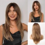 Elegant Long Straight Synthetic Hair Wig with Layered Bangs – High-Temperature Fiber, 150% Density, Rose Net Cap, Suitable for All Light Beige Tones, Perfect for Casual Attire