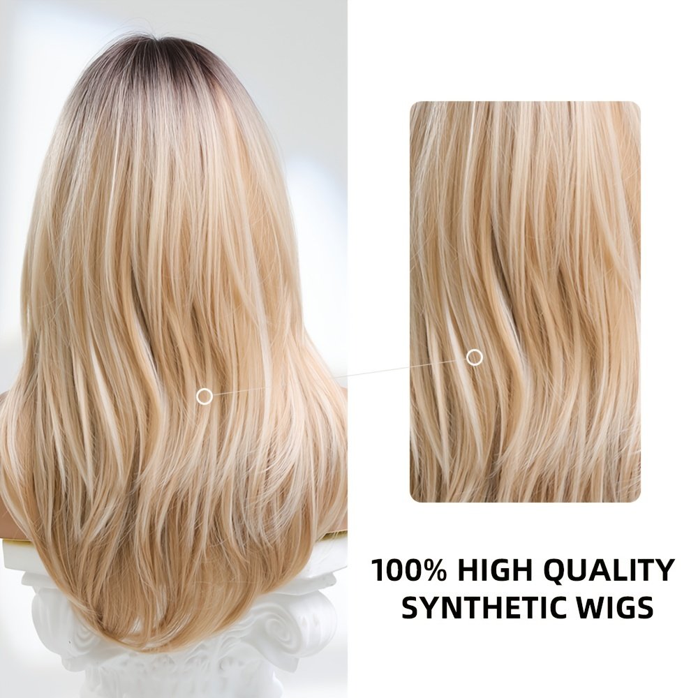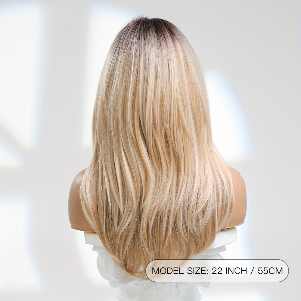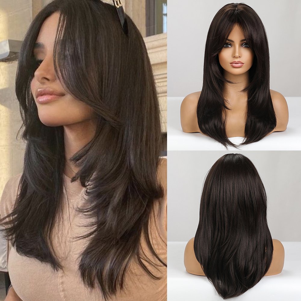 Elegant Long Straight Synthetic Hair Wig with Layered Bangs - High-Temperature Fiber, 150% Density, Rose Net Cap, Suitable for All Light Beige Tones, Perfect for Casual Attire