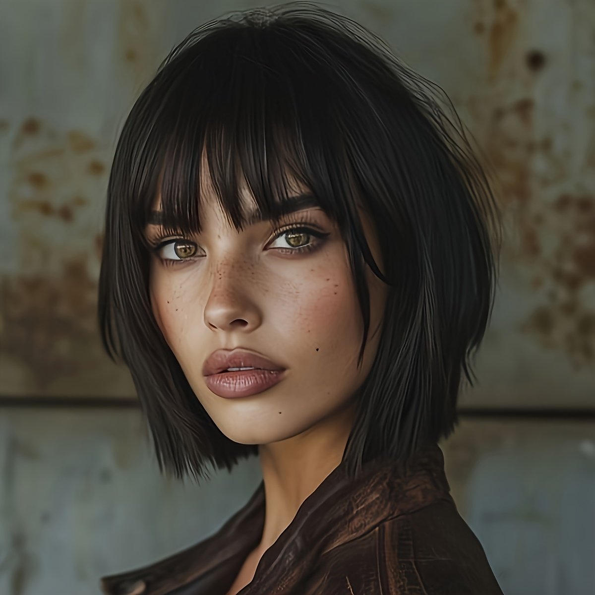 Woven Wigs Elegant Straight Haircut with Bangs, Middle Part Clavicle Length, High Temperature Fiber Synthetic Wig for Women, 150% Density, Rose Net Cap, Brown Daily Style